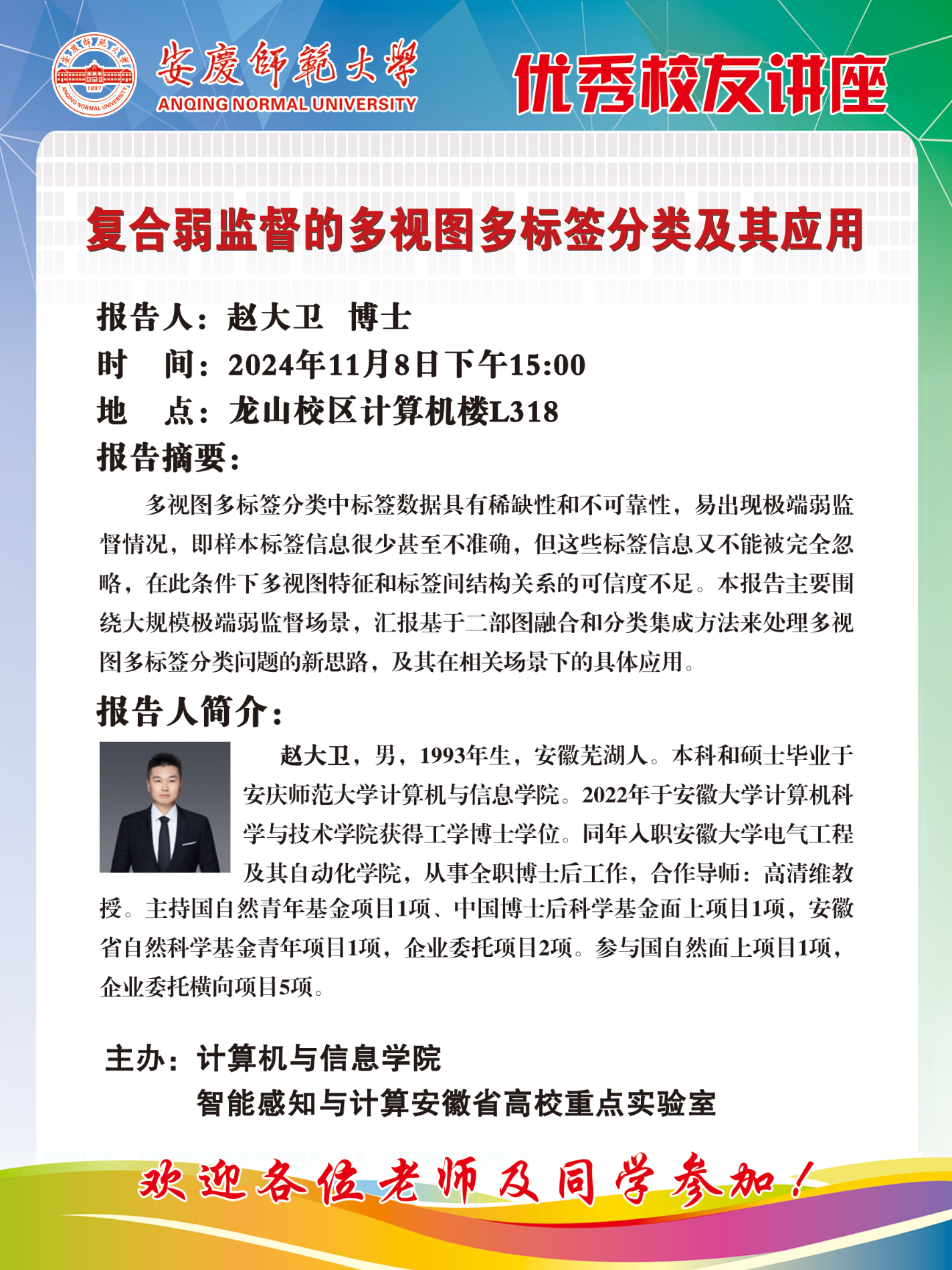 12月5日至6日,公司成功举办“创一流学科,育拔尖人才”计算机学科高质量发展论坛。论坛由太阳成tyc33455ccwww主办,智能感知与计算安徽省高校重点实验室、安徽省皖江文化数字化保护与传承工程研…
