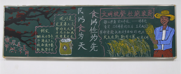 本次大赛分为教室设计和寝室设计两大部分,本次教室设计以“文明就餐,拒绝浪费”为主题,2020级各班级不仅将责任晚自习教室打扫的一尘不染,而且以“文字+绘画”的形式诠释对主题的理解。装满粮食的竹篓、怀抱粮食的农民、开心就餐的员工……一幅幅表达节约粮食、文明就餐的字画被刻印在文渊楼三楼和四楼各教室的黑板上。2020级计算机类3班引用了诗句“历览前贤国与家,成由勤俭败由奢”,深刻表达了勤俭节约对于一个国家、一个民族乃至个人的重要性。在评委走进教室的前一刻,2020级计算机类2班的李绍宇才刚完成黑板报的最后一笔。“比赛前觉得作品色彩还不够明亮,所以和同学一起过来赶工,希望能把它做得更完美。”李绍宇解释道,在他们的作品中,“光盘行动,文明就餐”八个大字被放置在板报的中央,背景是两个色彩鲜明的捧着光盘的卡通人物,未干透的颜料画让整个作品看起来更加鲜活生动。