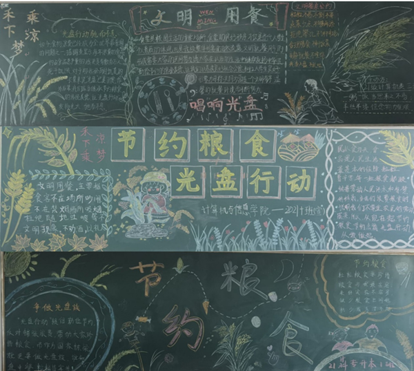 本次比赛分为“文明就餐,反对浪费”为主题的教室设计和“构建和谐寝室,促进共同成长”为主题的寝室设计两个部分,前后共历时两周。教室方面,各班级班委集思广益,精心谋划,充分发挥班级同学的创造能力和动手能力,黑板、卫生角、宣传栏及文化长廊不仅打扫得一尘不染,而且设计装扮各具特色,一幅幅表达节约粮食、文明就餐的字画被刻印在文渊楼三楼和四楼各教室的黑板上,营造出浓厚的勤俭节约文化氛围。“为了纪念袁隆平老爷爷,我们班特别在板报上面描绘‘禾下乘凉梦’场景和一位长了翅膀的老爷爷在细心呵护一株稻穗的成长,以此劝诫同学们厉行节约,杜绝浪费。”2021级计算机三班派出的讲解员如实介绍着自己班级的黑板报的独特之处与其中体现的不一样的含义。