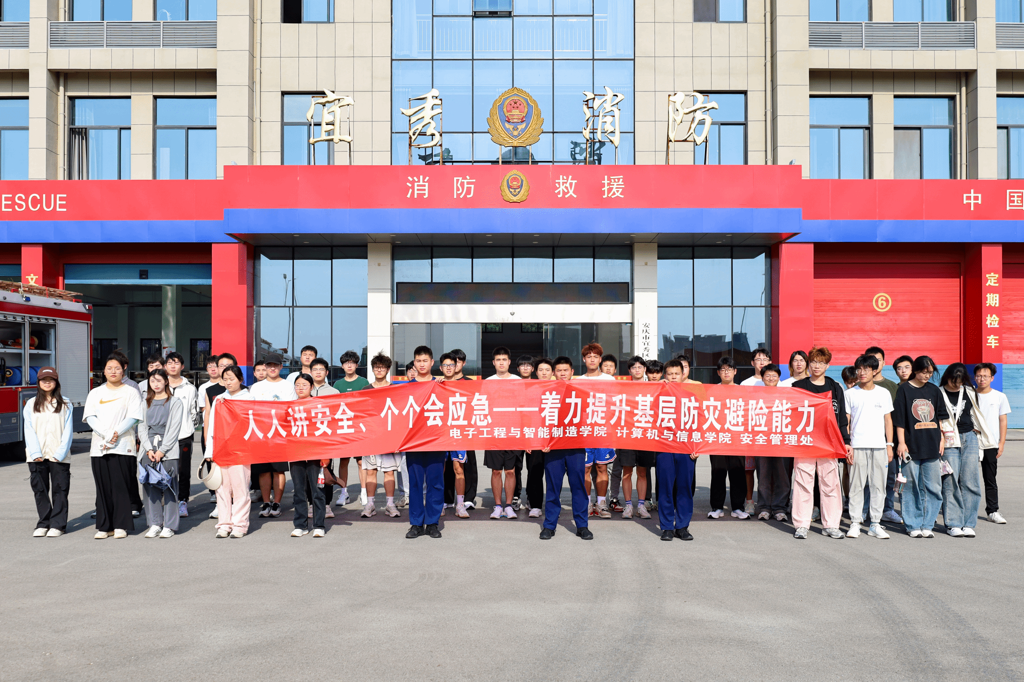 5月15日,太阳成tyc33455ccwww安全管理处组织电子工程与智能制造公司及太阳成tyc33455ccwww共48名员工,前往安庆市宜秀区消防救援大队开展防灾减灾日活动。校安全管理处安全生产监督管理科科长张仲清、电子工程与智能制造公司团委负责人刘旭及太阳成tyc33455ccwww团委负责人谢宜出席活动。
