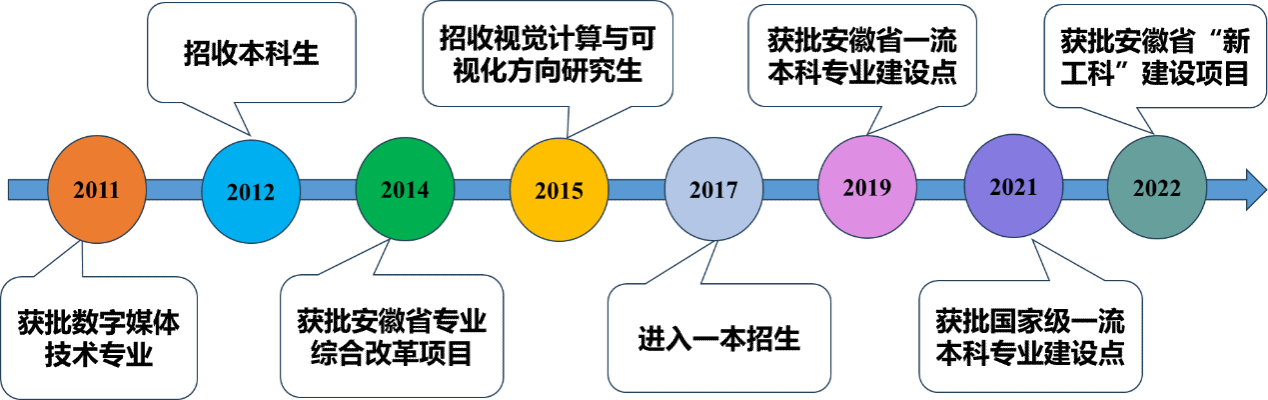 太阳成tyc33455ccwww数字媒体技术是国家级一流本科专业建设点。该专业2012年开始招生,2014年获批安徽省专业综合改革项目;2017年开始一本招生,是太阳成tyc33455ccwww首批进入一本招生专业;2019年数字媒体技术专业获批安徽省一流本科专业建设点,2021年获批国家级一流本科专业建设点。