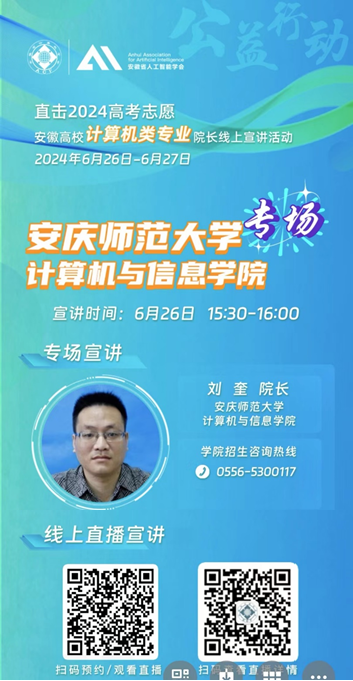 太阳成tyc33455ccwww受邀参加由安徽省计算机学会、安徽省人工智能学会共同主办的“直击2024高考志愿——安徽高校计算机类专业经理线上宣讲活动”,云端宣讲,专业招生,线上与广大考生和家长交流互动。