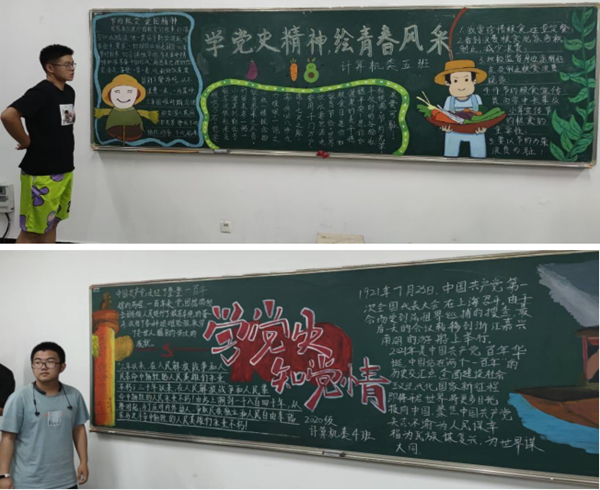 大赛前,各班级高度重视,认真查阅资料,积极完成板报创作。从版面设计、色彩调和、文字书写等方面进行了精心谋划,各板报主题突出、构思巧妙、内容丰富、整洁美观,从南湖红船——星星之火可以燎原——遵义会议——洛川会议——西柏坡——天安门等等画面,有八女投江、一条被子的故事、“砍头不要紧,只要主义真。杀了夏明翰,还有后来人”的夏明翰等等革命英雄先进事迹,多层次展现了青年老员工对党史学习的理解及其成效。有的板报运用图文并茂的形式讴歌了党的百年奋斗历程和伟大成就,有的板报颂扬党的百年奋斗历程中形成的光荣传统和优良作风,有的板报从重大历史事件、人物创造的历史性贡献着手阐述其产生的伟大的革命精神。其中,2020级计算机大类四班的设计独树一帜,报头“学党史,知党情”紧扣主题,介绍了中国从站起来、富起来到强起来的艰辛探索和历史必然,引领同学们深刻认识党先进的政治属性、崇高的政治理想、优良的工作作风。