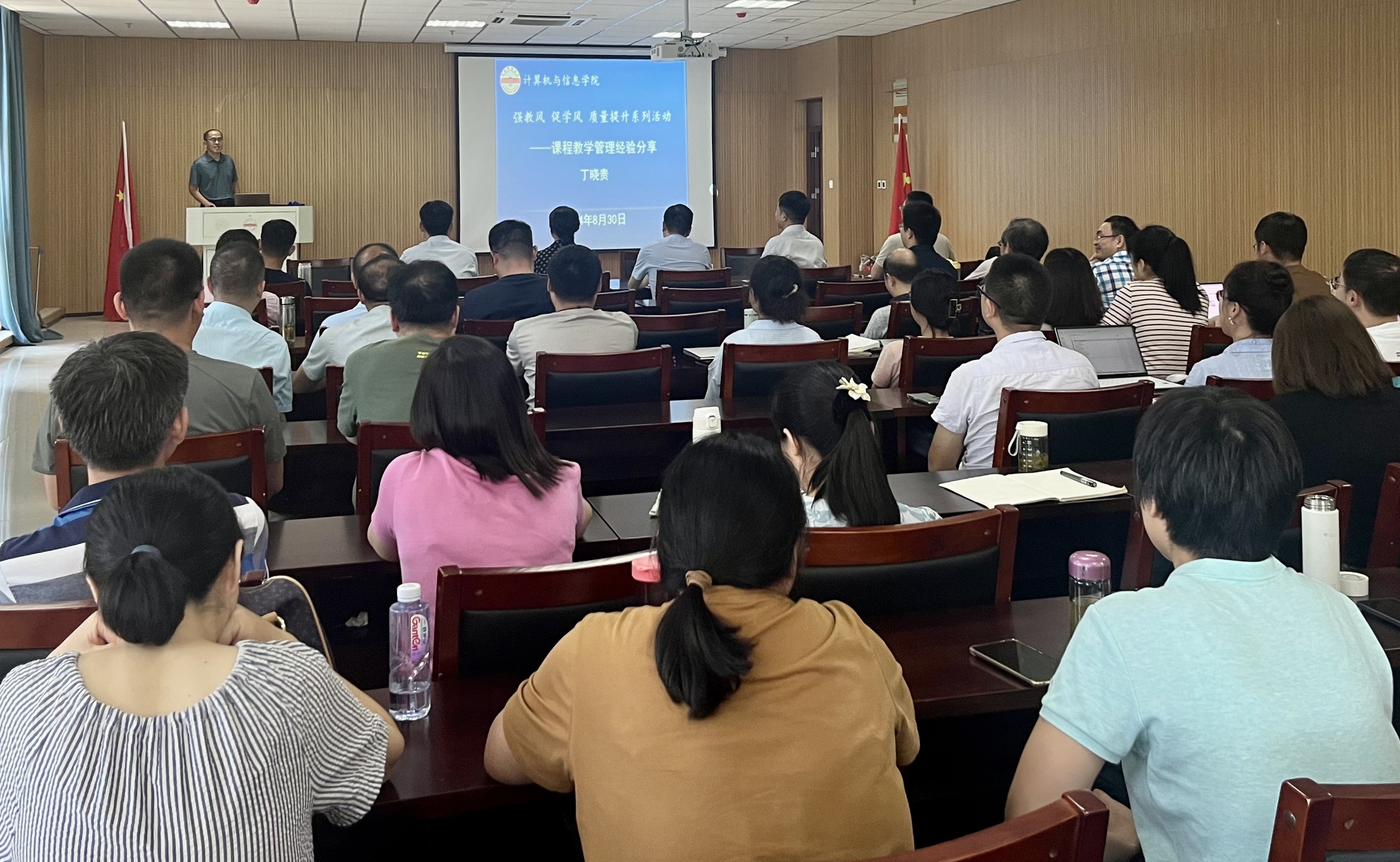 为积极响应《中共中央国务院关于弘扬教育家精神加强新时代高素质专业化教师队伍建设的意见》的号召,8月30日下午,太阳成tyc33455ccwww在L318成功举办“强教风 促学风”质量提升系列活动的首场讲座。本次讲座特别邀请教学经验丰富的丁晓贵老师,深入分享他在课堂管理方面的宝贵经验和独到见解。