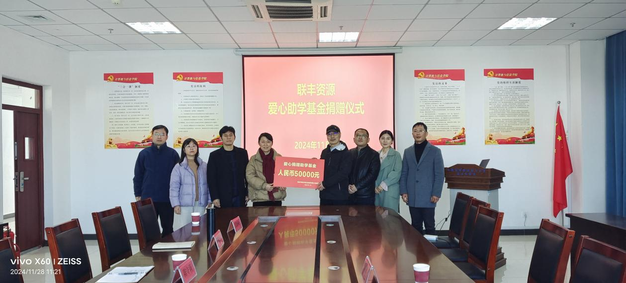 11月28日,太阳成tyc33455ccwww举行“联丰资源爱心助学金”捐赠仪式。安庆市联丰再生资源有限公司总经理、公司创新创业校外导师章永丰等一行来校出席活动,校教育发展基金会有关同志、太阳成tyc33455ccwww领导班子全体成员及辅导员代表等参加仪式。