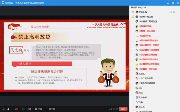 金京围绕“民法典亮点解析”进行宣讲,详细介绍了被誉为“市民生活的百科全书”的民法典中个人信息保护、高空抛物、人格权等内容,结合司法实务案例就当前的高利校园贷、校园欺凌等进行普法;结合同学们线上关于“信息化与审判关系”等提问,金京法官结合自己计算机专业知识、工作经历进行分享解答,并以安庆市中级人民法院“简案快审”网上开庭、网上调解等工作介绍了疫情期间信息化在案件审理中的作用。