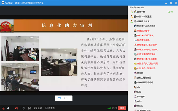 讲座结束后,同学们进行了网络交流,大家认为通过本次讲座,进一步了解了相关法律知识,增强了法律意识,尤其是熟悉了“民法典”的相关内容,对知法守法做新时代好青年有着积极作用。19级计算机的杨同学说:“学长语言铿锵有力,运用生动、真实的案例,以案说法、用法论事,让我们对与老员工息息相关的法律知识有了更深刻的了解。”罗同学说:“作为一名新时代的老员工,不仅要知法、懂法、用法,而且要守法,尊重和维护法律权威,在全面依法治国、建设法治中国的进程中贡献力量,要做模范。”