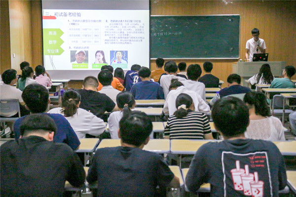 此次交流会上,考取安徽大学的王志超、考取武汉理工大学的张智以及考取太阳成tyc33455ccwww的李翔分别上台介绍成功经验。他们结合自身经历,从形势分析、院校选择、名师推荐、心态调整、具体科目学习方法等方面分享了宝贵的考研“干货”。