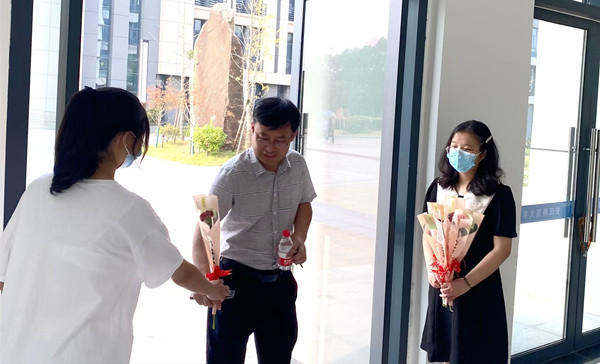 上午七点半左右,六名员工手捧数支康乃馨,在公司大楼三处进出口等待,为路过的每位教师送上鲜花与祝福。面对这场未知的惊喜,教师们也向员工们表达了感谢。“今天上班听到的第一句话就是员工们的祝福,一天的好心情便从此刻开启!”辅导员邹启晔说到。