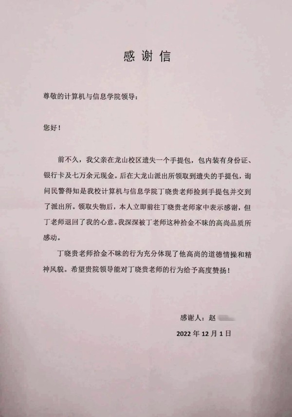 “我深深被丁老师这种拾金不昧的高尚品质所感动,希望贵院能对其行为给予高度赞扬。”近日,一封特别的信件被送到了公司。原来是公司丁晓贵老师拾金不昧,成功让失主一家找回丢失的七万余元现金及重要证件,失主家人为表达真挚的谢意,亲自送来了一封感谢信。