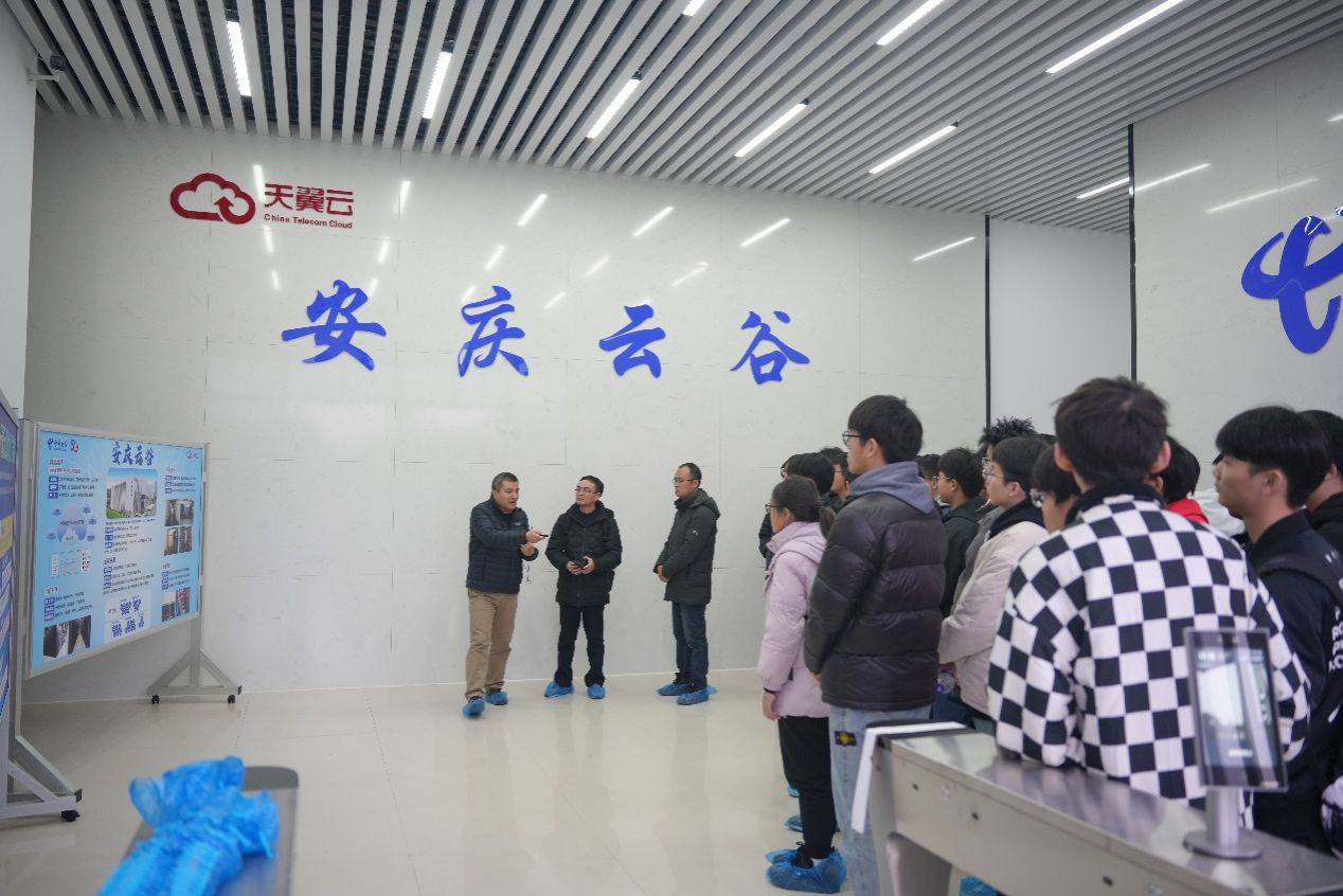 在安庆电信数字运营中心,同学们先后现场参观了城市大脑运营中心、安庆云谷、5G创新应用实验室等,了解了工业大脑数据机房等软件硬件设施建设情况,中心工作人员向同学们现场展示了数据归集、共享应用等情况及主题式智慧应用场景,解读了城市大脑运行情况,结合计算机网络有关课程知识点讲解如何利用大数据、人工智能等技术,为政府、企业和社会各界提供智能化应用,强调了计算机网络在数字化信息化建设中是不可或缺的支撑,实践学习现场,在老师们的指导下同学们还对部分智慧应用场景进行了现场体验。