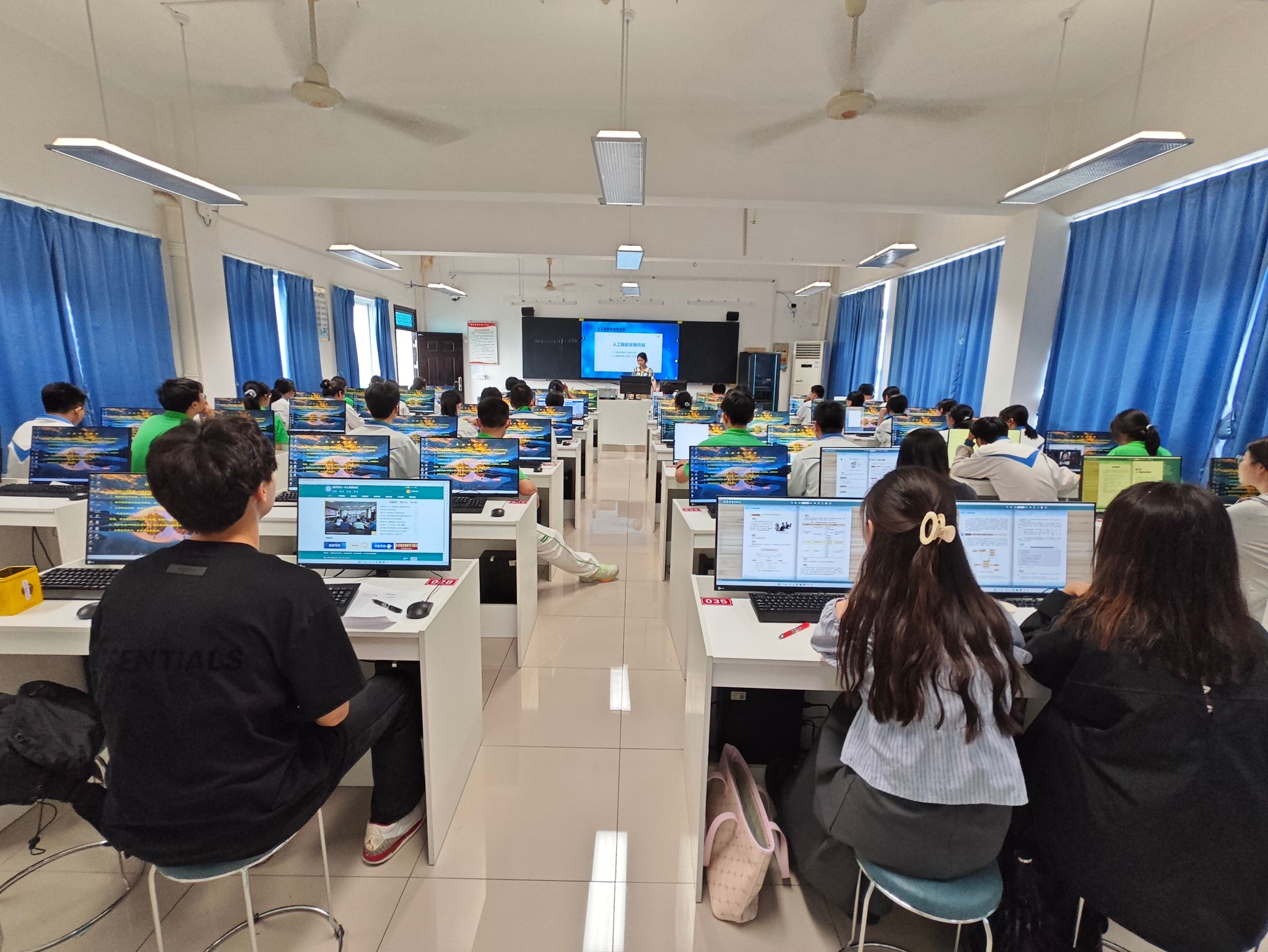 同学们首先观摩安庆市石化第一中学王楠老师主讲的《人工智能发展过程》教学示范课,对中学信息技术课程内容的前沿性有了更精准的理解,对课程的组织逻辑和教学技巧有了更深层次的学习。